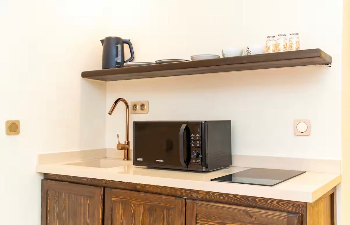 Salon et cuisine : salon lumineux avec télévision, cuisine entièrement équipée (réfrigérateur, congélateur, micro-ondes, bouilloire, cafetière, vaisselle et ustensiles)